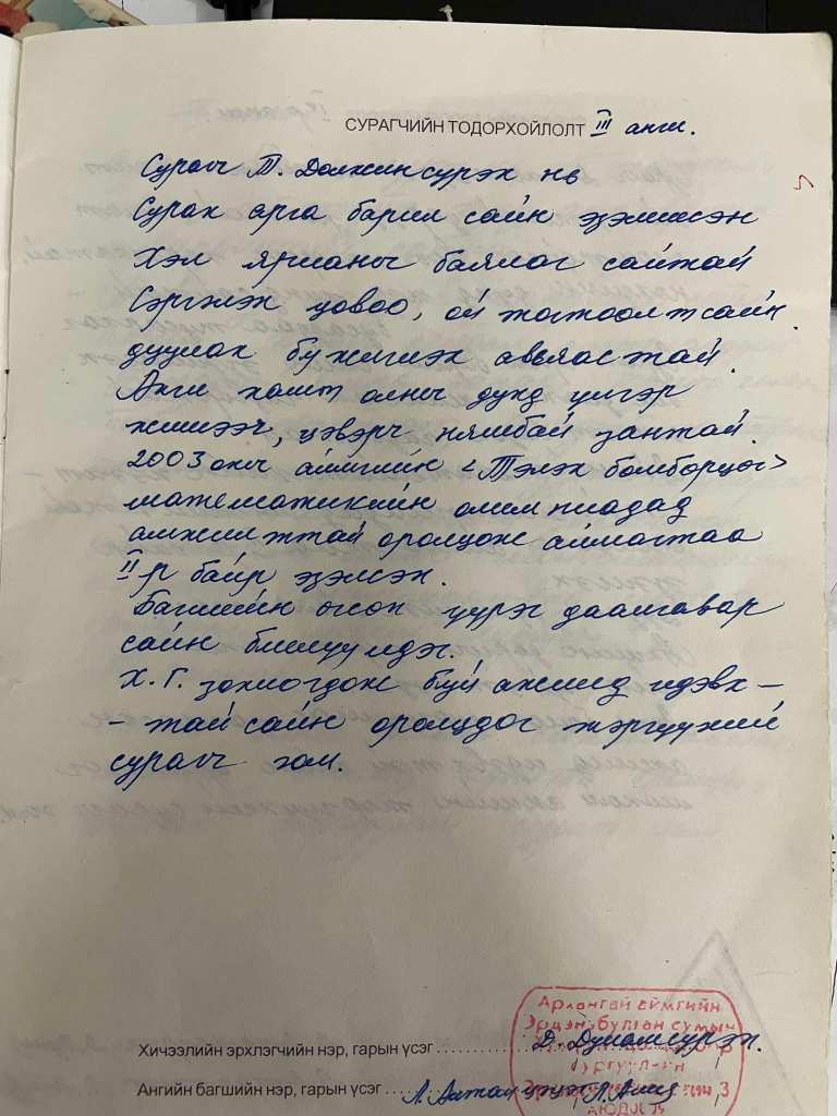 Маргааш нь олимпиад болж нөгөө л байнга таардаг, битүүхэндээ бэргээд байдаг өөр сургуулийн, сумдын шилдгүүдийг харахаар нээрээ л тэд нар ч бас чадахгүй л байгаа юм шиг харагдаад цаанаасаа тийм итгэлтэй болоод явчихаж билээ. Энэ хүн бол миний бага ангийн багш Л.Алтанцэцэг. Ингэж л энэ хэдхэн үг тэр бяцхан охины өөртөө итгэх итгэлийн галыг нь мөнхөд бадраасан юм даа. Сургууль төгсөтлөө аймгийн олимпиадын эхний 4 байрнаас унаж үзээгүй, 3 удаа аймагтаа тэргүүлж улсын олимпиадад шалгарч оролцож байсан амжилтыг багшийнхаа тавьсан суурийн ач гэж итгэлтэй хэлнээ.